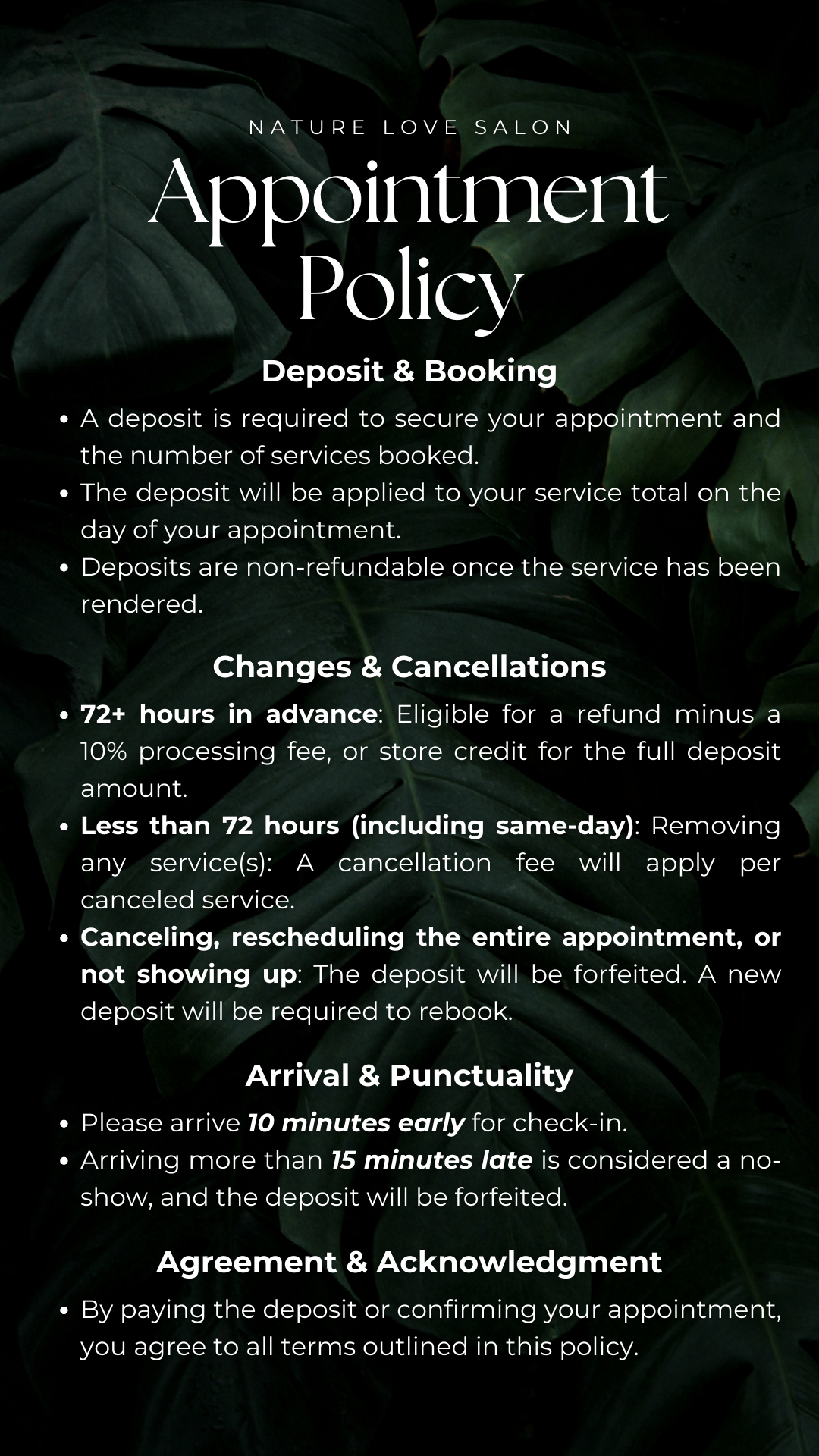 Welcome to Nature Love Salon, where relaxation and rejuvenation meet exceptional care. Our mission is to create a serene environment where each and every guest feels valued, pampered, and at ease. From the moment you step into our salon, we aim to provide an experience that allows you to unwind, refresh, and escape the stress of daily life. And to ensure every guest enjoys their time with us to the fullest, we’ve thoughtfully outlined key guidelines for etiquette and booking policies tailored specifically for our valued clients in Sacramento, CA. So whether you’re here for a solo session of self-care or planning a special group celebration with loved ones, we are committed to making every moment seamless and enjoyable. Let us take care of the details while you focus on embracing your well-deserved time to relax.